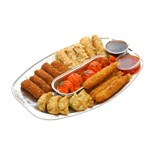 Gestoomde en gebakken dumplings, gamba loempia’s, torpedo garnalen, gamba kroketjes, piri-piri saus en teriyakisaus